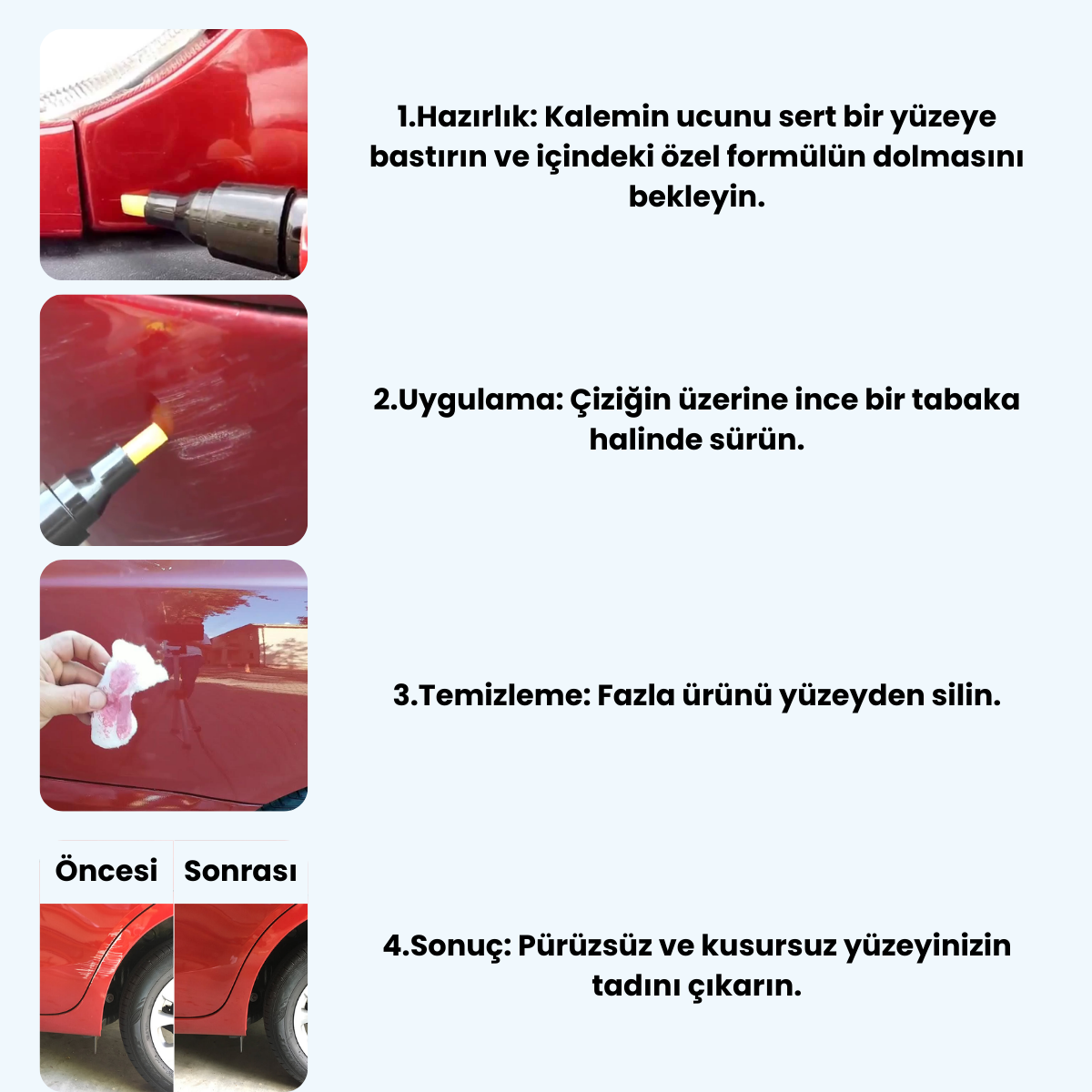 Sihirli Kalem ile çizikleri anında ve kalıcı olarak yok edebilir, aracınızın değerini koruyabilir ve bir servet harcamadan ilk günkü gibi görünmesini sağlayabilirsiniz.